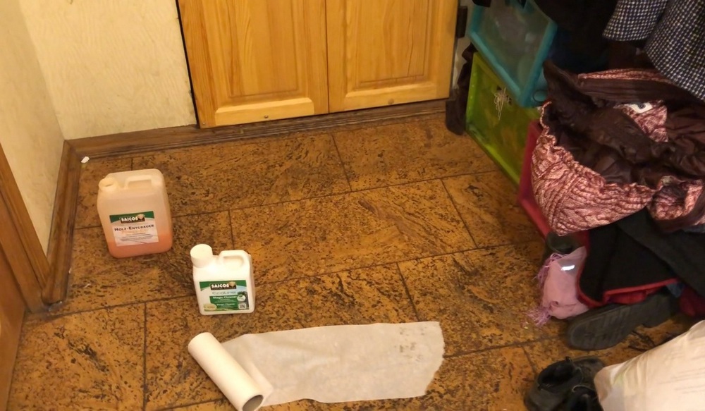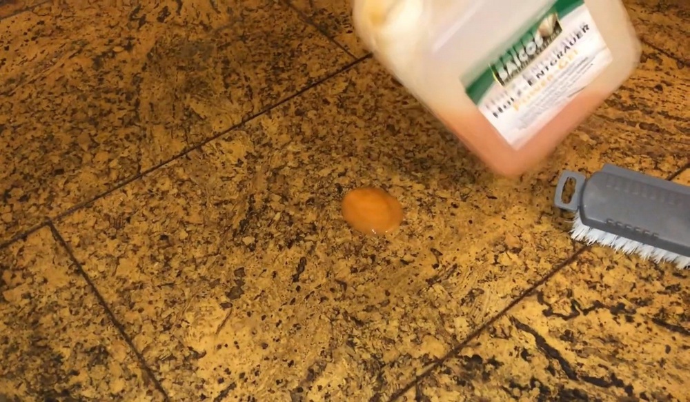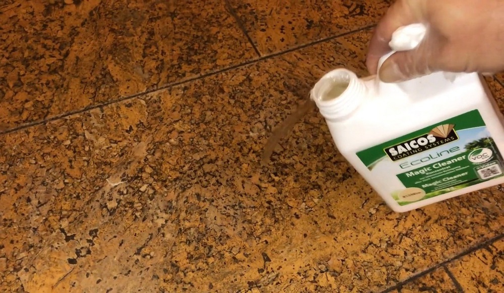 Для эксперименты мы специально взяли одну пробковую плитку на самом проходном месте – прямо на входе в квартиру, то есть, наиболее изношенное место. Сначала нанесли средство Magic Cleaner – налили небольшое количество и просто равномерно распределили по поверхности. Можно воды добавить чуть-чуть побольше, потому что пробка достаточно пористая, чтобы везде это средство попало. Далее дали средству примерно пять-десять минут поработать, после чего аккуратно потерли щеткой, чтобы вынуть загрязнения из структуры пробки.