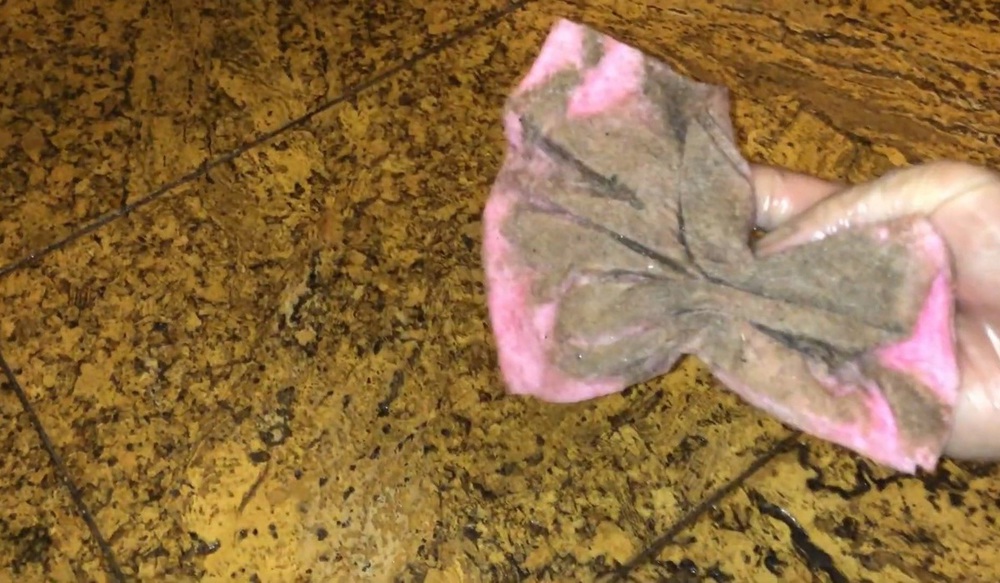 После этого первого этапа очистки уже виден промежуточный результат. Даже не досохшая после очистки лицевая поверхность становится светлее, чем было. После очистки Magic Cleaner уже видно, что плитка, которую обрабатывали на входе, стала намного светлее.