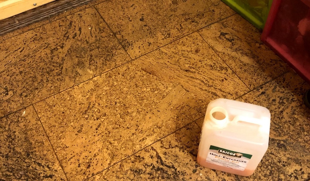 Но мы попробовали сделать результат еще лучше и воспользовались специальным гелем Holz-Entgrauer Power Gel. Распределили гель по поверхности таким образом, чтобы как можно больше его попало в стык между пробкой и в саму ее структуру. Уже через несколько минут после того, как мы нанесли Power-Gel, видно, что поверхность стала значительно светлее.
