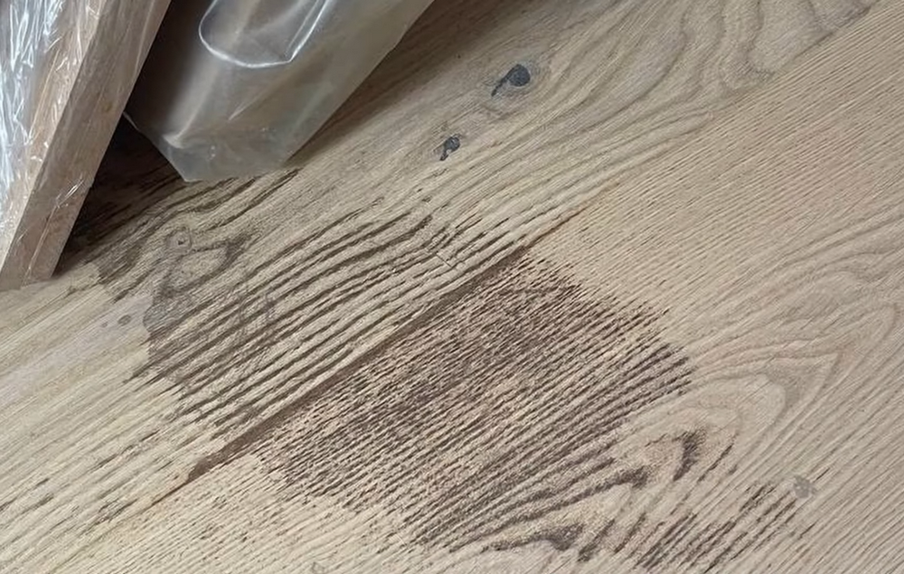 - Локальные потемнения от воздействия воздействие излишней влаги, особенно при мытье полов в торцах паркетных планок или в торцах ламелей на паркетной или инженерной доске, где есть даже минимальное, практически незаметное щеление. Туда попадает влага, в торец древесины она впитывается очень интенсивно, долго там находится, и со временем происходит потемнение. По этой же причине происходит потемнение паркета от воздействия мочи домашних животных, а также на участках, где стоят цветы в горшках: когда их постоянно поливают, происходит излишнее увлажнение на этих местах.
