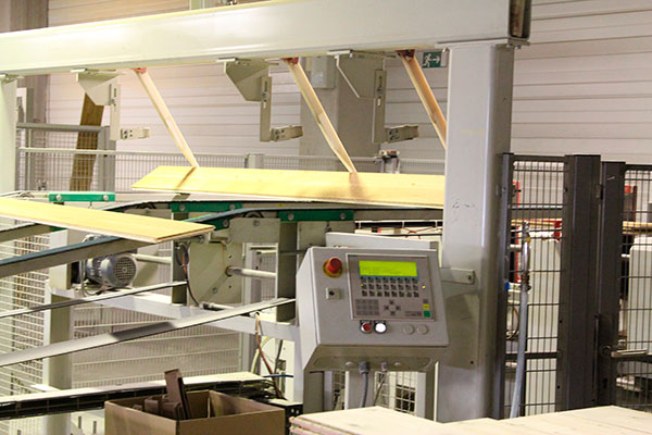 Замер 250 показателей в секунду для 15 ламелей позволяет производить автоматическую селекцию по распилу и одновременную отбраковку. Каждый вид сортировки направляется к своему станку. На конвейерной линии пролетающие на высокой скорости прямоугольники напиленных слоев дерева склеиваются по длинным, а затем по коротким сторонам.