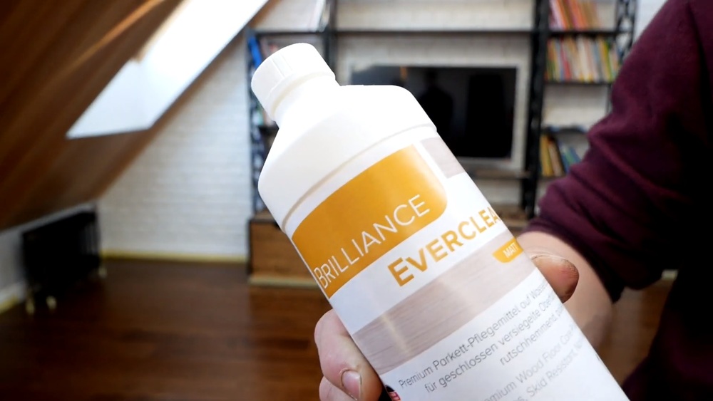 После этого клиент попросил нас сделать еще и сервисное обслуживание. Для этого мы использовали средство по уходу за лакированным паркетом Berger Everclear L93 (тоже матовое), которое изначально препятствует скольжению, а еще дополнительно препятствует разъеданию лаковой пленки современными бытовыми чистящими средствами.