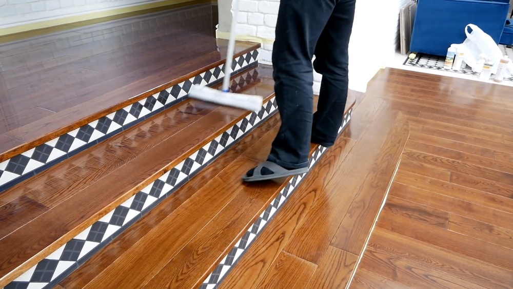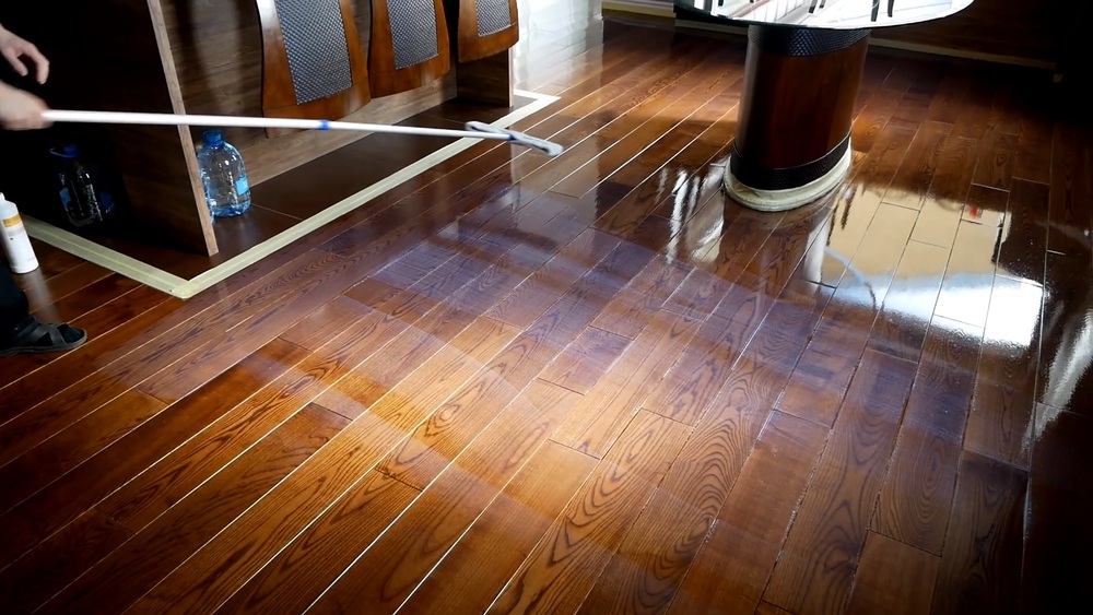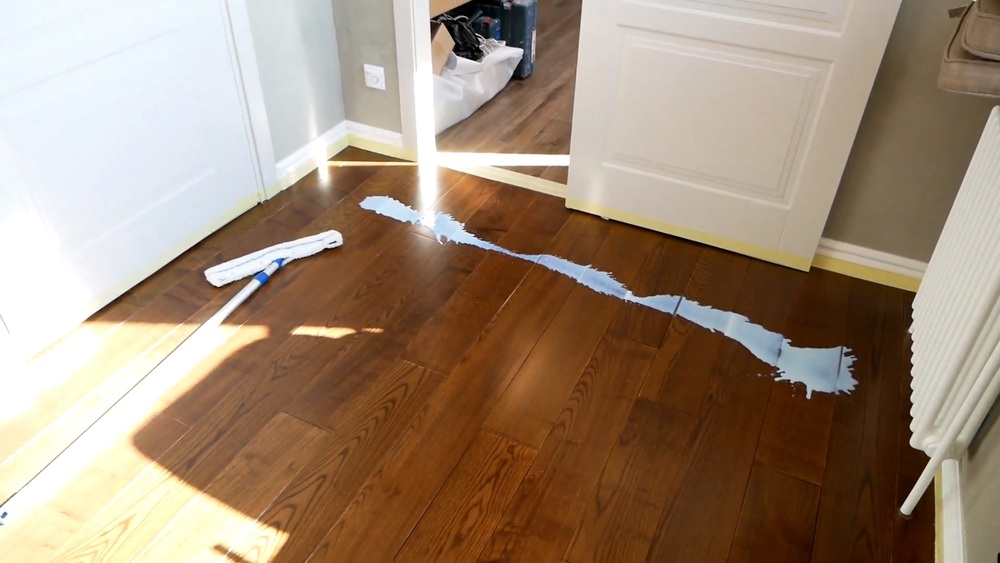 Поскольку лаковая пленка на этом паркете свежая, ее не нужно сильно очищать и не нужно делать обезжиривание, поэтому мы не стали наносить Cleaner L91, как сделали бы это в иной ситуации. На данном объекте мы сразу нанесли состав Everclear L93.