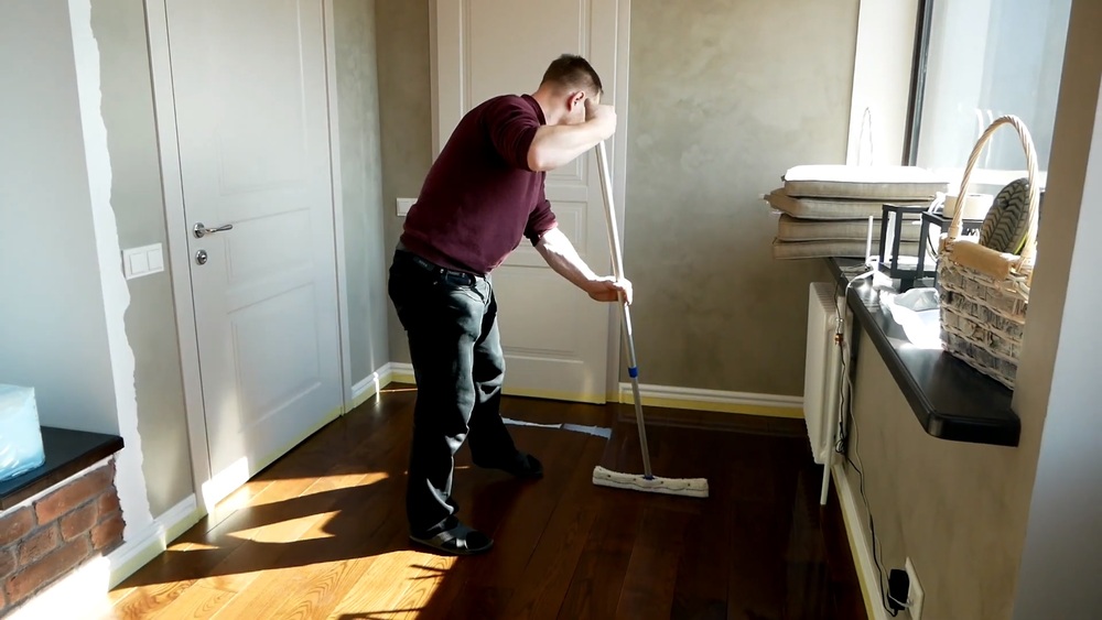 Для нанесения нам понадобилась швабра с мягкой шубкой. Перед использованием мы тщательно взболтали средство. Средство наносится очень легко: мы аккуратно выливаем его на пол, закрываем банку, чтобы она не упала, и средство не разлилось, и раскатываем средство шваброй. Впоследствии, чтобы это средство хорошо работало, его добавляют при еженедельной уборке в воду – достаточно добавить 3-4 колпачка на ведро воды, чтобы чуть-чуть возобновить покрытие.
