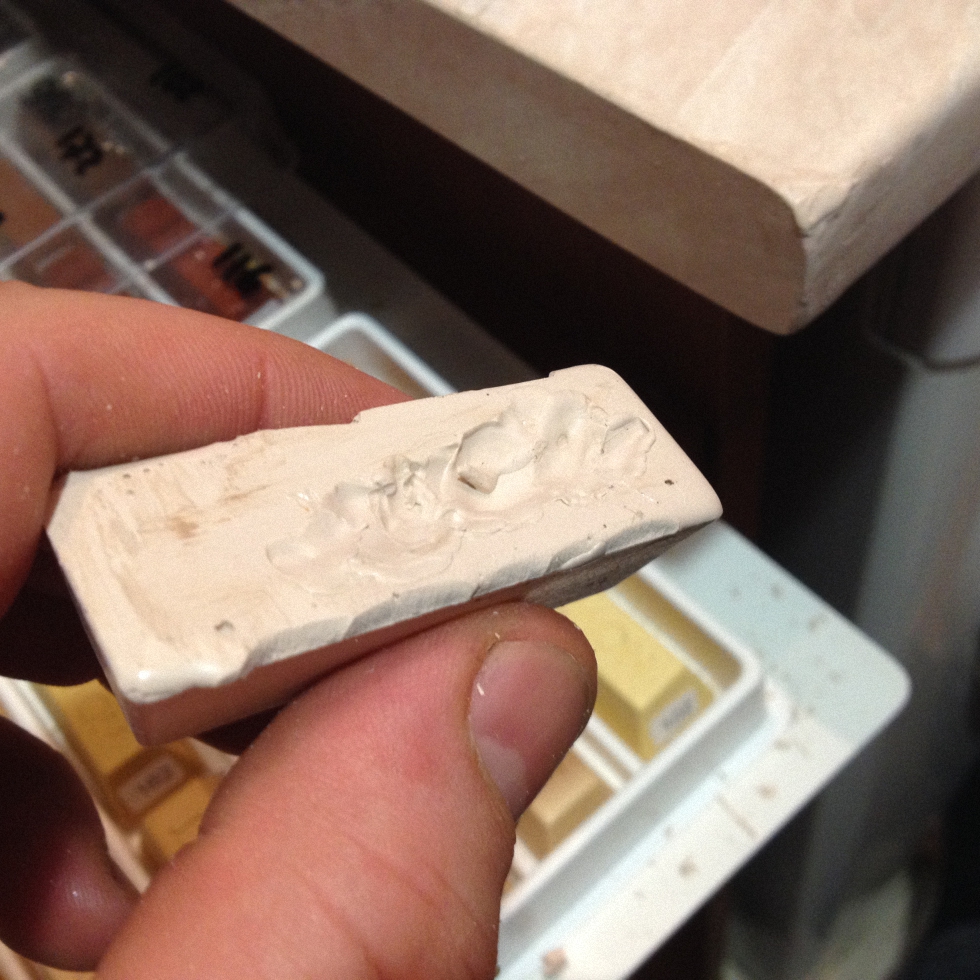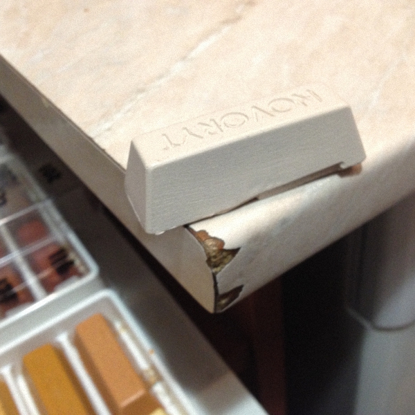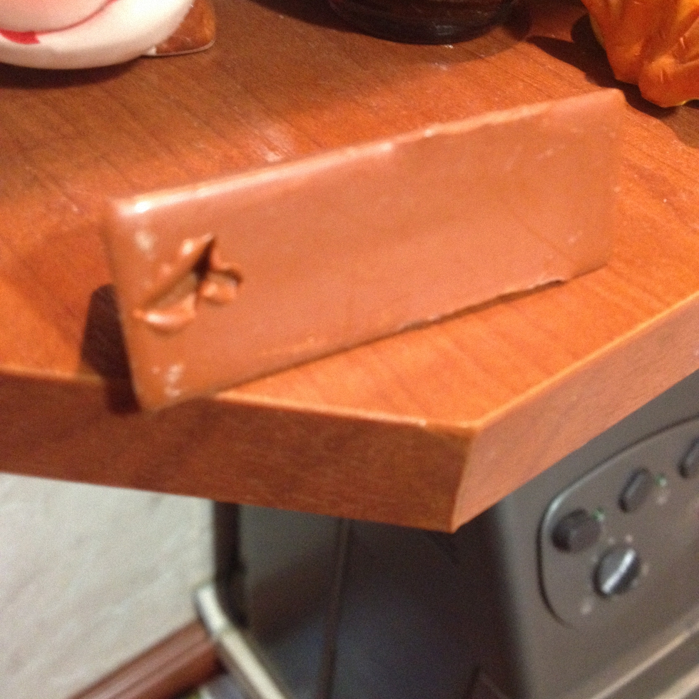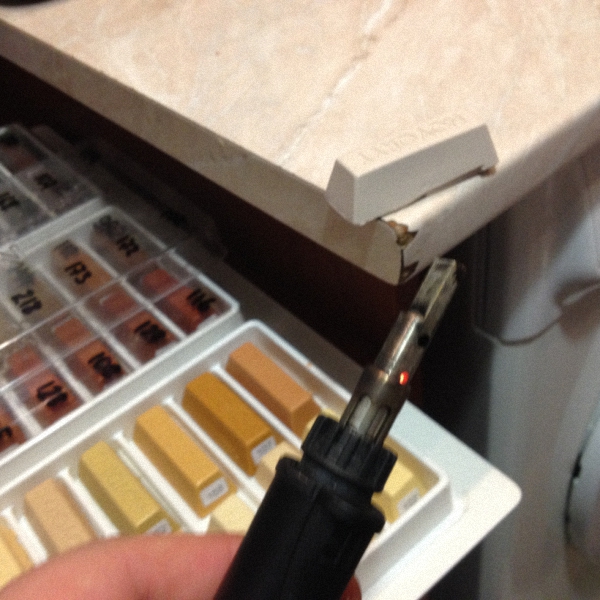 Открыв чемоданчик, я обнаружил бруски двух видов – твердые расплавы шпатлевки и мягкие воски. Мягкий воск, оказалось, продавливается ногтем и легко деформируется. Так как повреждение столешницы находилось на торце, который будут постоянно задевать, от мягкого воска я сразу решил отказаться.