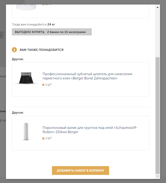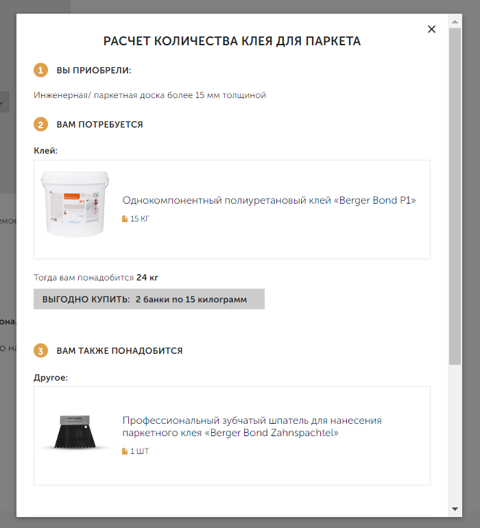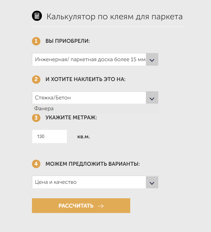 А сколько конкретно клея и грунтовки понадобится для вашей площади? Об этом мы можем прочитать часовую лекцию, но есть способ лучше – воспользуйтесь онлайн-калькулятором, который мы специально подготовили для клиентов. Этот калькулятор вы найдете в нашем интернет-магазине, и он поможет вам выбрать и посчитать количество грунтовки, клея, шпателей и валиков для укладки паркета на вашем объекте. Вам нужно только выбрать вид паркета, ввести площадь помещения, указать, планируется ли укладка на бетон/стяжку или фанеру, и отметить свои пожелания по бюджету, и вы получите результат. Доверяйте профессионалам!