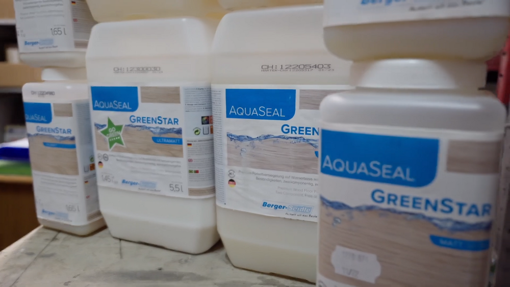 Правильный лак для пробковых покрытий – это лак с высоким показателем эластичности. В нашем ассортименте есть наш топовый лак, который называется Aqua-Seal Green Star от Berger. Это двухкомпонентный лак, где основной компонент и отвердитель, причем, в составе отвердителя нет ни грамма изоцианата. По названию мы уже интуитивно понимаем, что это лак с самыми высокими экологическими показателями. Лак Green Star имеет очень высокую эластичность и максимальную износостойкость, поэтому однозначно подходит для пробковых поверхностей.