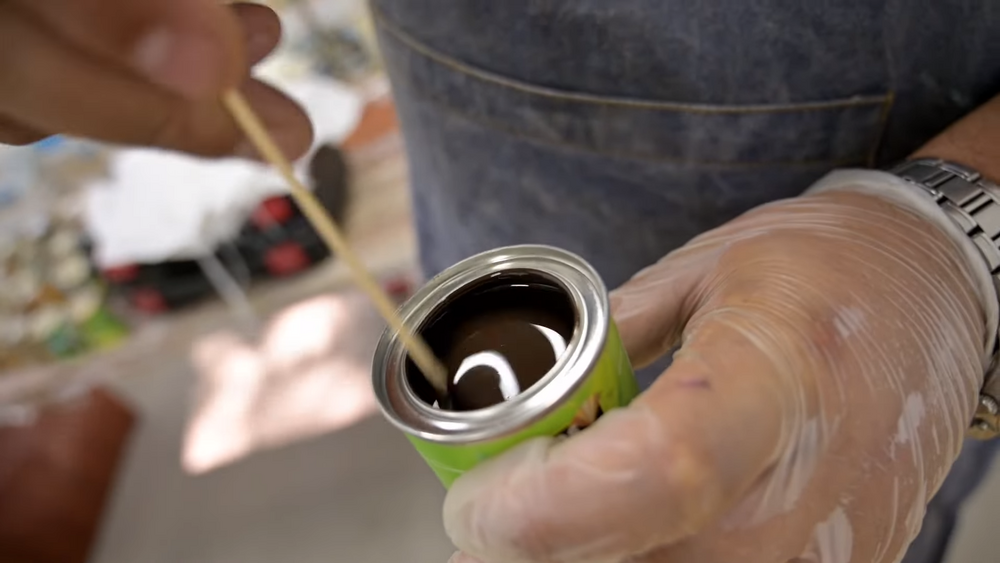 - Первым делом мы хорошенько взбалтываем состав масла, чтобы было все однородно. У масла, которые мы используем для эксперимента, очень экономичный расход, но на разных породах древесины он будет разным.