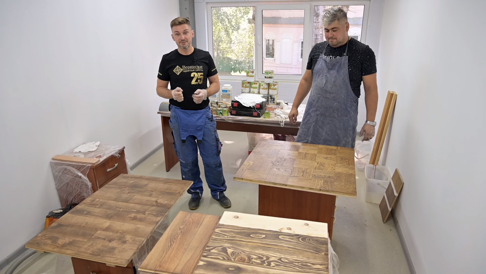 Чтобы наглядно проиллюстрировать свою мысль, я с коллегой из компании Saicos Виктором Смирновым провел эксперимент. Для тонировки мы подготовили 4 щита из разных пород дерева –дуба, сосны, бука и березы. Все эти щиты одинаково отшлифованы одним номером зерна, и мы будем наносить на них одно и то же цветное масло абсолютно одинаковым методом.