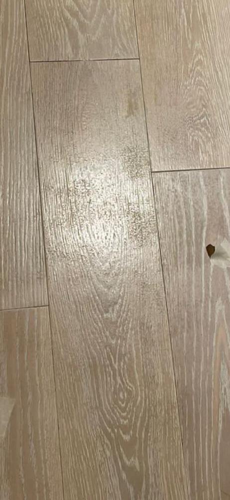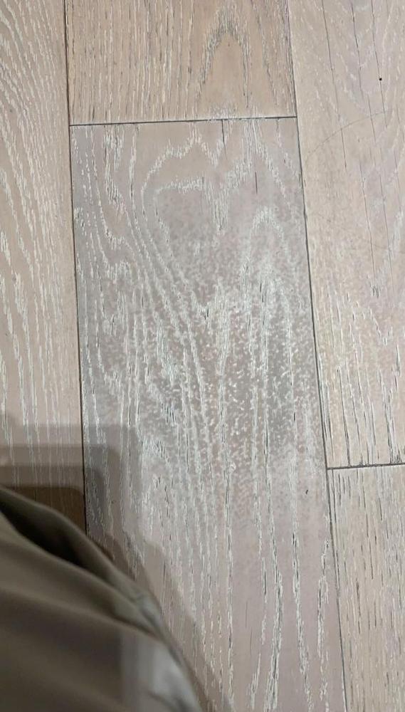 Продолжаем делиться с вами нестандартными ситуациями, которые происходят при выполнении паркетных работ. Одна из них произошла недавно в Москве: к нашему эксперту по паркету Леониду Хлебникову обратился один из мастеров-паркетчиков, который выполнял работы на объектах и покрывал паркет маслом с твердым воском. Стоит отметить, что этот мастер неоднократно присутствовал на семинарах нашей компании: приходил и сам, и со своей бригадой. И вот сейчас наткнулся на такую сложность: на объекте применяли масло с твердым воском неизвестного производителя. В качестве первого слоя нанесли белое масло без воска (делали выбеливание), после его высыхания сделали тест тряпкой на полное высыхание – как будто все высохло. Далее взяли другой продукт под названием «масло с твердым воском», нанесли первый слой с помощью валика и оставили сохнуть до следующего дня. На следующий день увидели, что многие места по текстуре дерева просто остались матовыми, чего быть не должно. Мастер сразу же обратился к нам с просьбой помочь и выслал фотографии.