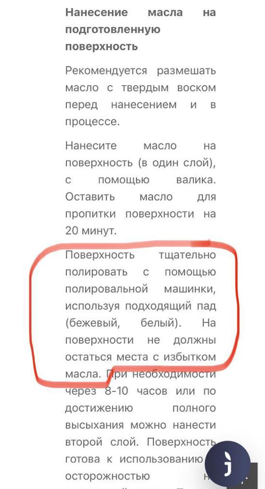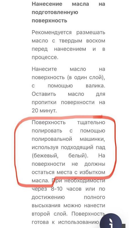 Тогда я запросил информацию о материале. Мне прислали название масла с твердым воском, по которому я нашел лист технической информации и увидел, что этот материал должен наноситься с помощью валика. По инструкции через 20 минут после нанесения валиком необходимо располировать излишки масло-воска с помощью белого/бежевого пада или ветоши. Опытному мастеру вот эта информация сразу скажет, что в составе материала применяются не твердые воски, а мягкие, которые не затвердевают, поэтому их остатки и необходимо сполировывать с поверхности.