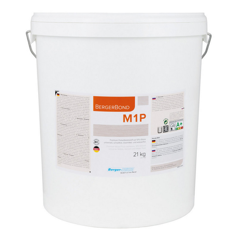 Прочно-эластичный клей Berger M1P – это наш козырь в рукаве. Если клей M1 можно применить в 80% случаев, то M1P – в 95% случаев. Это флагманский клей, который есть у нас и вообще на рынке паркетных клеев. Это золотая середина эластичности и упругости, он очень хорошо держит паркет. Практически не дает ему никуда двинуться, но при этом есть какой-то небольшой ход движению, что позволяет не давать напряжения на основание. Конечно, если мы говорим про какие-то гигантские размеры массива, какие-то большие крупные доски, даже такие передовые технологии целое дерево могут не удержать. Для широкой и длинной массивной доски мы рекомендуем использовать двухкомпонентный клей и соблюдать температуру и влажность. Но М1Р справляется с широкой длинной инженеркой и порой даже с укладкой массивного паркета.