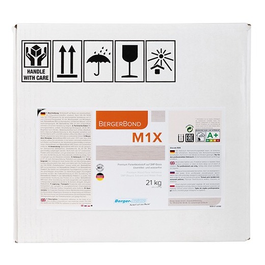 Эластичный клей Berger М1Х – хит наших продаж. Фасовка – коробка, в ней 3 специальных фольгированных пакета по 7 кг. Это очень удобно: паркетчик достает пакет, отрезает уголок, выдавливает нужное количество клея себе для работы, кладет обратно, закрыв пакет на прищепку. Так получается максимальная выработка, клей не остается на таре, как это бывает с канистрами, например.