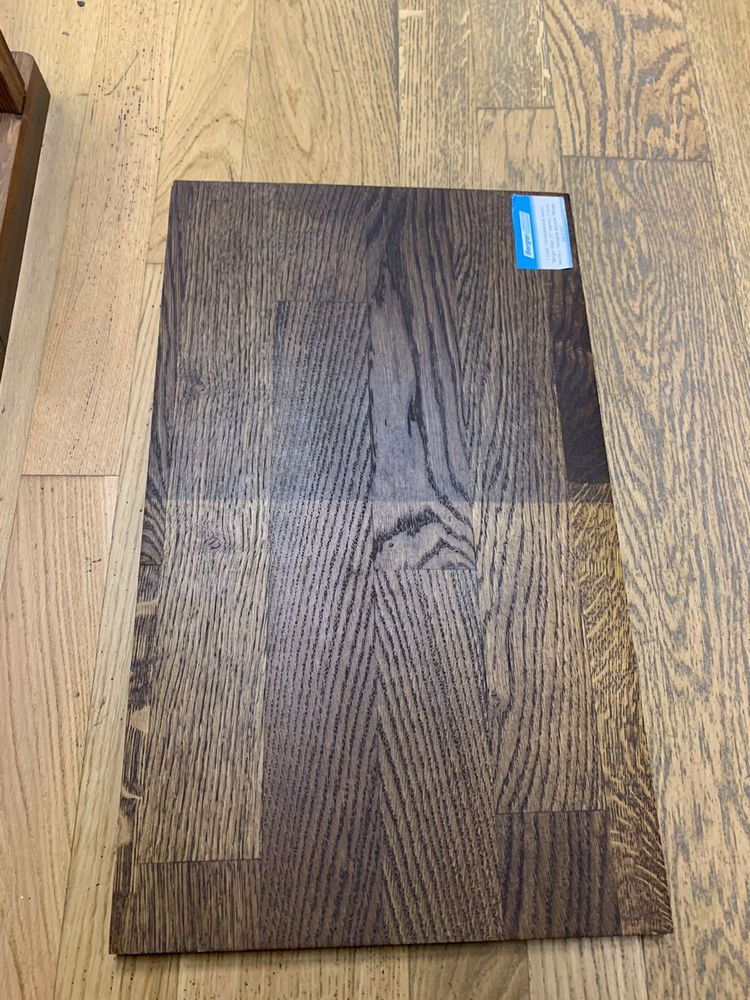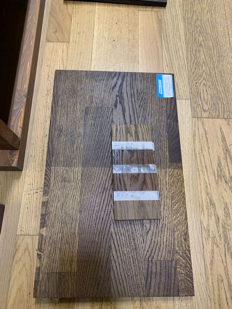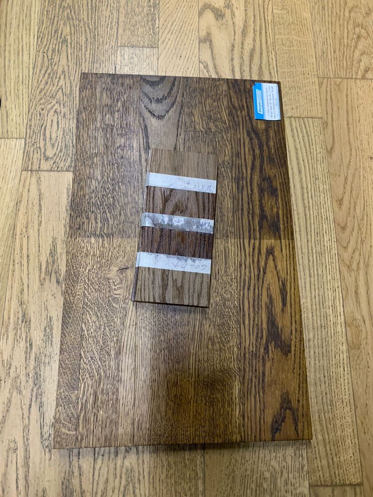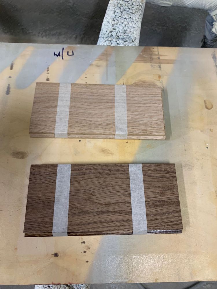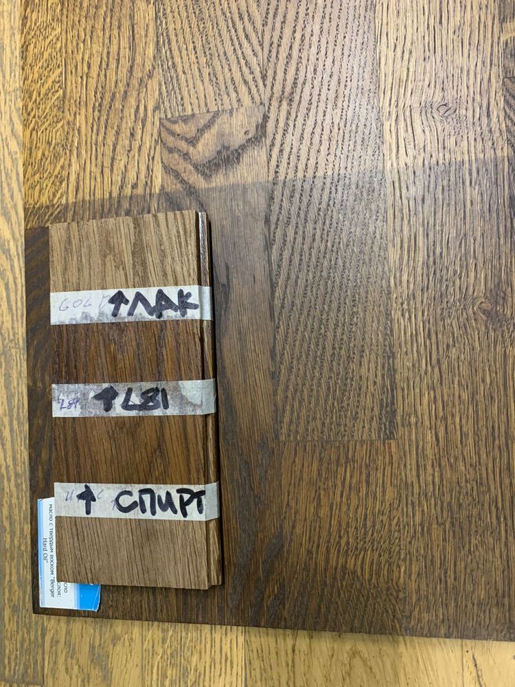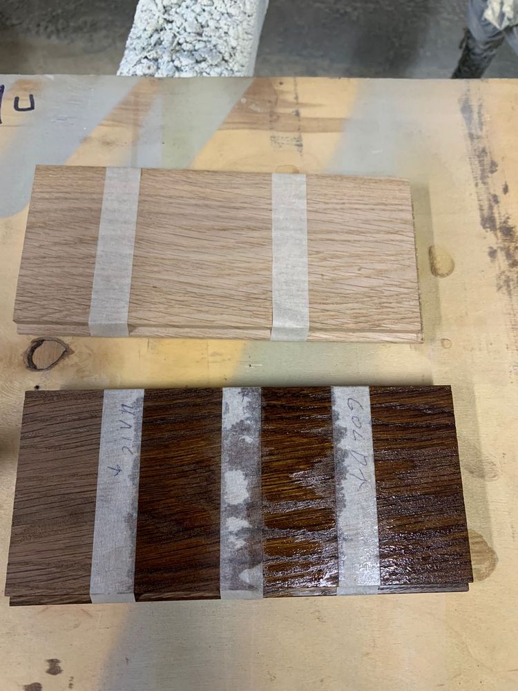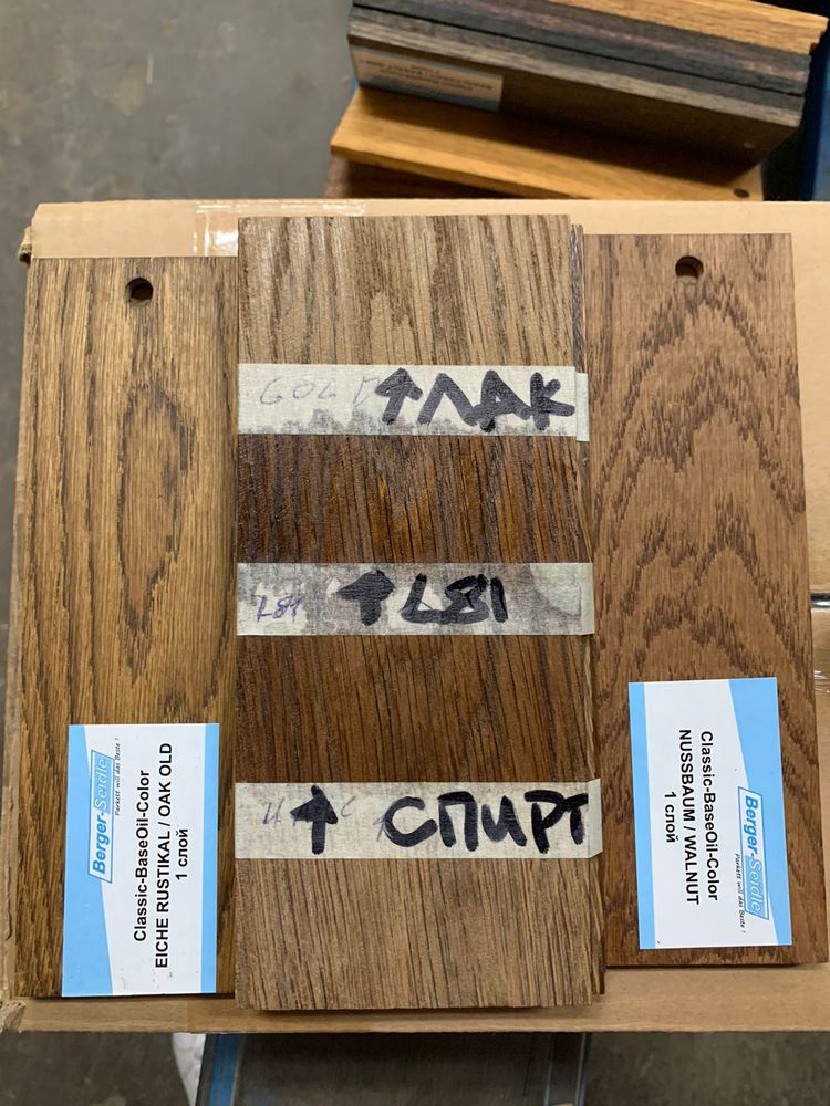 Мы взяли исходный образец термодревесины и привезли его из Новосибирска в Санкт-Петербург, чтобы сделать пробные выкрасы для выбора финишного покрытия паркета на объекте. Для подбора цвета использовали такие покрытия: