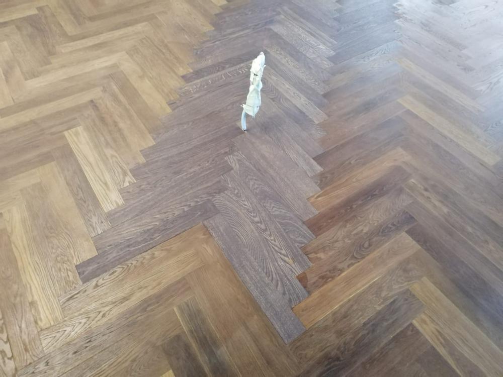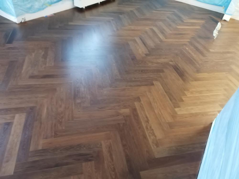 Результат работы вы можете видеть на фотографиях ниже. Как сказали сами мастера, ремонт получился очень качественным, и цвет тонированного натурального дуба удалось подобрать хорошо. Конечно, если тщательно рассматривать паркет под разными углами, то профессиональные паркетчики заметят замену древесины, но в обычных условиях результат выглядит отлично.