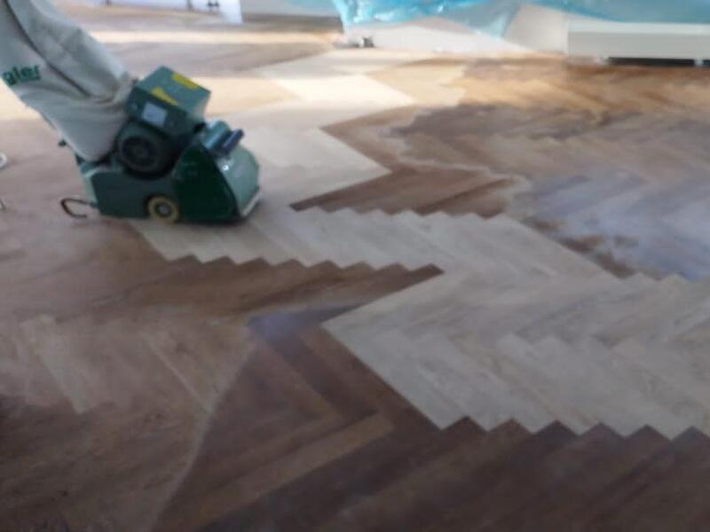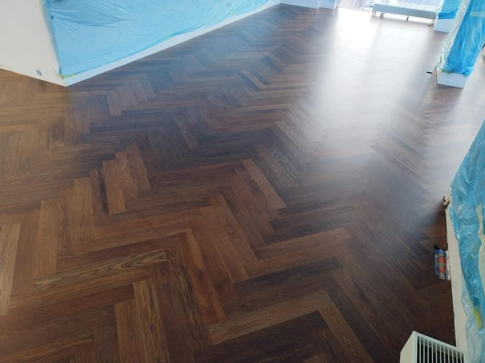 - После высыхания весь паркет покрыли финишным двухкомпонентным полиуретановым лаком на водной основе Berger Aqua-Seal CeramicStar.