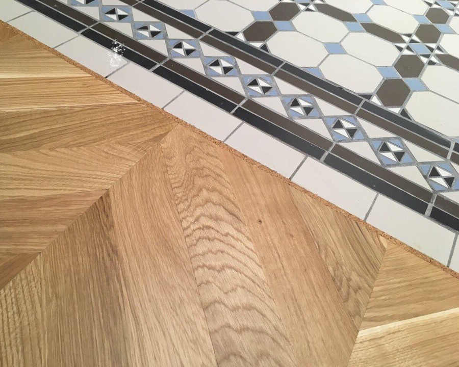 Локально клеить паркет вдоль линии плитки, на самом деле, нельзя, потому что паркет будет работать неправильно: он не сможет свободно расширяться во все стороны, он начинает отталкиваться от одного места, от этой плитки, а если с другой стороны помещения стоит какая-то тяжелая мебель, то получается, что мы зажимаем этот паркет с двух сторон. В таком случае, опять же, может произойти отход от плитки, и получится большая щель. Кроме того, при отхождении от основания паркет может просто приподниматься, что, конечно же, нехорошо. Выходом из ситуации при укладке инженерного паркета на подложку становится использование накладных порогов. А это снова «прошлый век» в дизайне интерьеров, так как сейчас большинство людей наоборот старается от порожков отойти.
