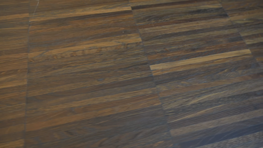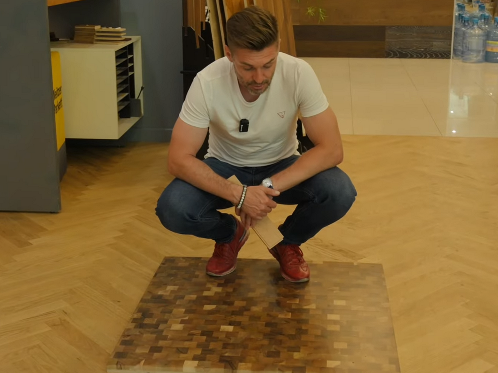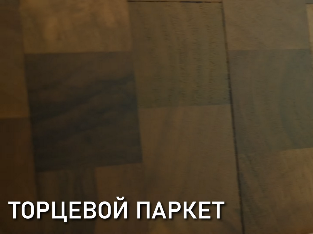 Еще один вид массивного напольного покрытия – это торцевой паркет. Если классический паркет укладывается на пол плашмя, индустриальный паркет укладывается боком, то торцевой паркет укладывается торцами вверх. Здесь все волокна смотрят вверх, и это очень классное качество пола, потому что волокна у древесины по сути являются ребрами жесткости. За счет этого торцевой паркет имеет просто сумасшедшую стойкость к механическому истиранию.