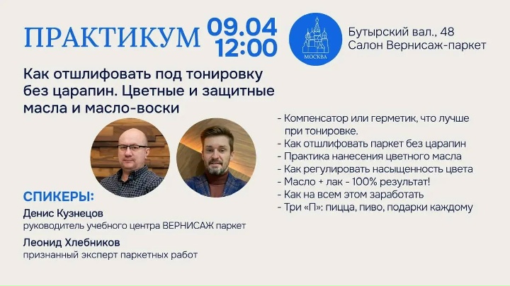 Уважаемые клиенты и партнеры! Приглашаем мастеров-паркетчиков на практикум «Как отшлифовать под тонировку без царапин. Цветные и защитные масла и масло-воски».