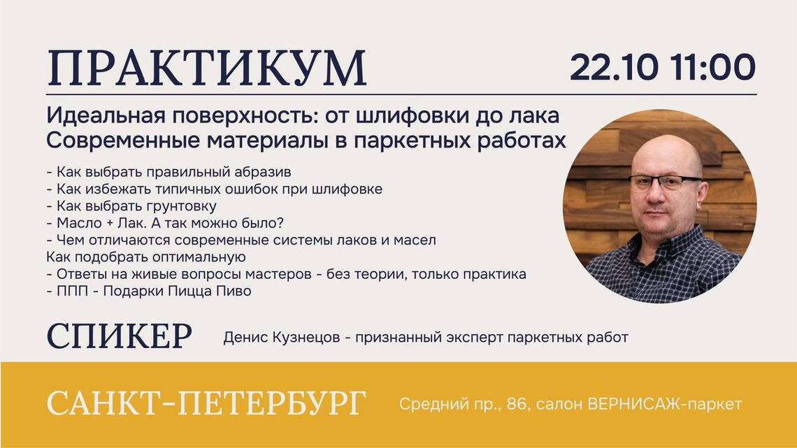 Уважаемые партнеры! Компания «Вернисаж» приглашает мастеров-паркетчиков и представителей паркетных фирм на практикум: «Идеальная поверхность: от шлифовки до лака. Современные материалы в паркетных работах».