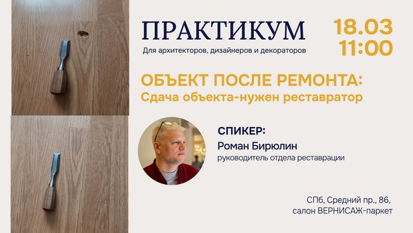 Уважаемые клиенты и партнеры! Приглашаем архитекторов и дизайнеров на практикум «Объект после ремонта: сдача объекта – нужен реставратор». В ходе практикума обсудим: