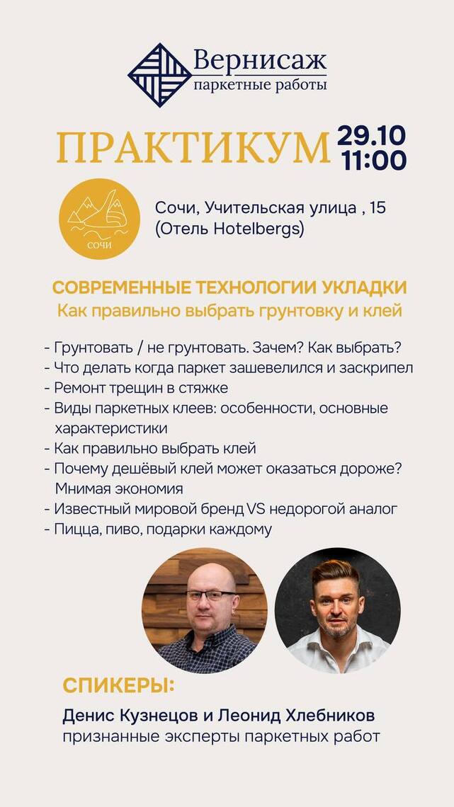 Уважаемые партнеры! Компания «Вернисаж» приглашает представителей паркетного бизнеса в Сочи на практикум «Современные технологии укладки паркета. Как правильно выбрать грунтовку и клей».