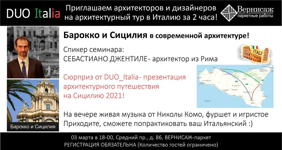 Уважаемые партнеры! Компания «Вернисаж» приглашает архитекторов и дизайнеров на семинар «Барокко и Сицилия в современной архитектуре».