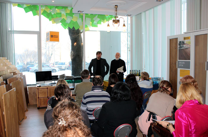 Возможно именно с этой аудиторией специалистов, жадных до новых сведений об инновационных средствах и методах отделки интерьеров и живо интересующихся новыми материалами и идеями, связана была разнообразная и насыщенная программа семинара. Она затронула проблемы художественного оформления помещений разного назначения, роль напольных покрытий как фонового средства или доминанты в создании современного облика интерьеров, технологию регулируемой подосновы напольных покрытий. В качестве главной темы была выбрана проблема создания деревянных полов на подогреве, которая еще сравнительно недавно воспринималась как табуированная. Ну, кому придет в голову укладывать на подогрев такой отличный теплоизолятор, как дерево? Однако вопрос оказался совсем не праздным. На примерах из практики создания, в том числе, и питерских строительных объектов специалисты «Вернисажа» показали, что дерево – материал, чья теплопроводность в 17-40 раз меньше, чем у таких привычных на подогреве материалов, как керамическая плитка, керамогранит, камень, – отлично может работать в этой схеме отопления помещений. Хоть это совсем не просто и требует специальной технологии и выбора особых материалов, которые по счастью сегодня в России вполне доступны.