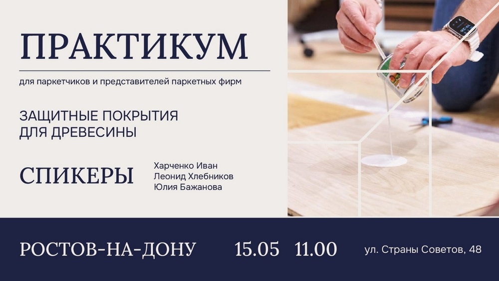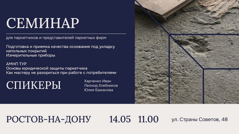 Уважаемые партнеры! Компания «Вернисаж» и Ассоциация мастеров напольных покрытий (АМНП) приглашают строителей, паркетчиков, тех.надзор и всех специалистов, работающих с древесиной, на двухдневный семинар-практикум «Подготовка основания под укладку напольных покрытий и защитные покрытия для древесины» в Ростове-на-Дону.