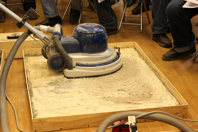 Таким же способом возможно удалить старую эпоксидную краску с основания, а также из грубой с неровностями стяжки просто шлифовкой получить выровненную поверхность, подходящую для дальнейшего настила паркета или фанеры.