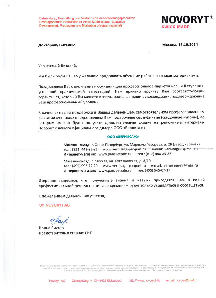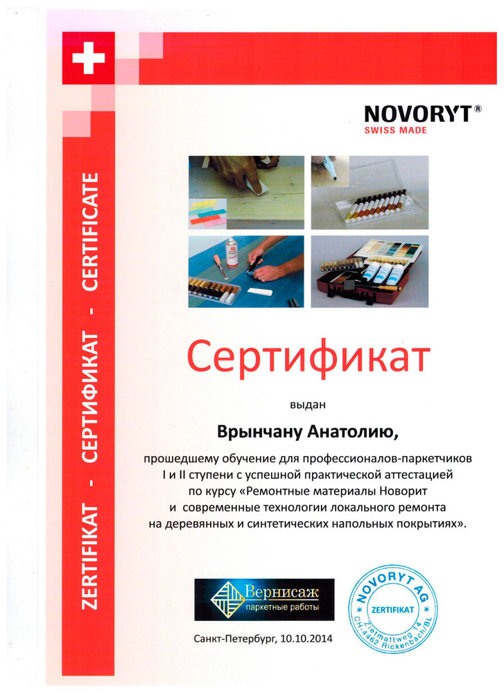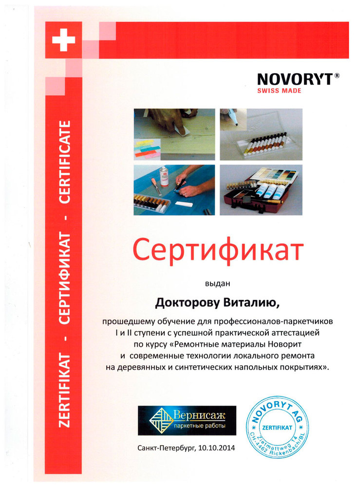 По результатам двухдневного практикума пять человек были признаны успешно прошедшими первую и вторую ступень обучения с успешной аттестацией по курсу «Ремонтные материалы Novoryt и современные технологии локального ремонта на деревянных и синтетических напольных покрытиях» и удостоены Сертификата, подтверждающего этот статус, а также от компании Novoryt им были вручены подарочные сертификаты на сумму 2000 рублей.