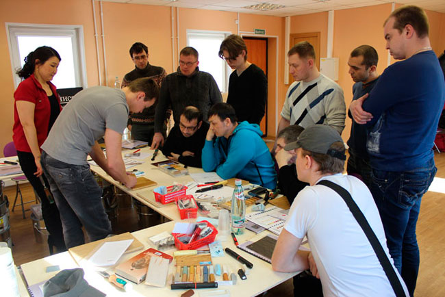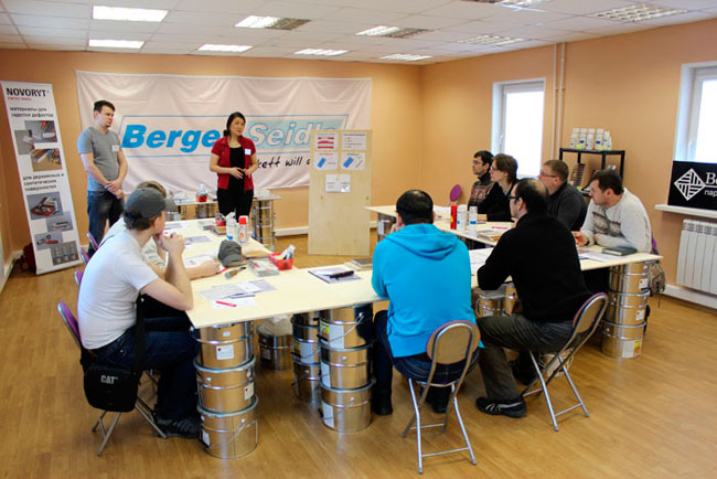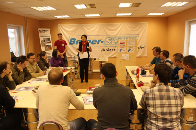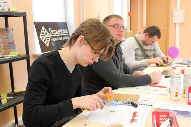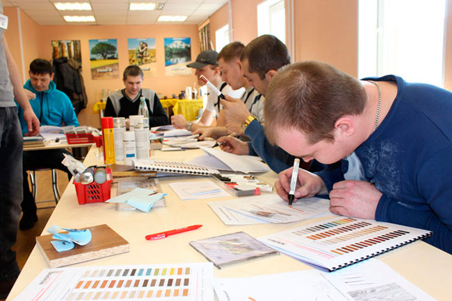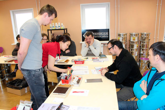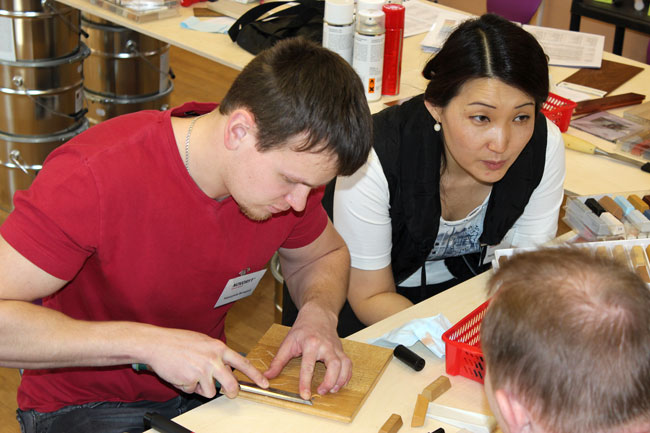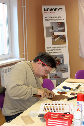 Две группы по 10 человек в каждый из дней в течение 6 часов получали навыки работы руками с продукцией. Это была первая ступень обучения - знакомство с реставрационными материалами и инструментами, чтобы мастера имели представление о том, какие виды повреждений устранимы локально, какими средствами, способами, техниками это достигается, какая последовательность более правильная при заделке сколов, царапин, выбоин и других механических повреждений на деревянных и других поверхностях.