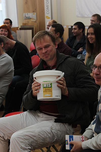 Победитель конкурса на знание свойств клея MS1 получает ведро клея.