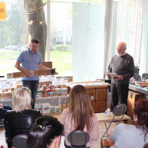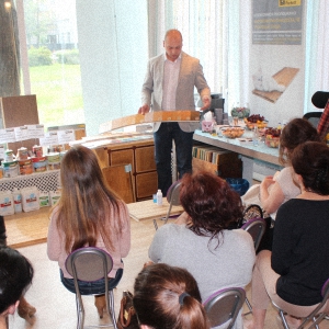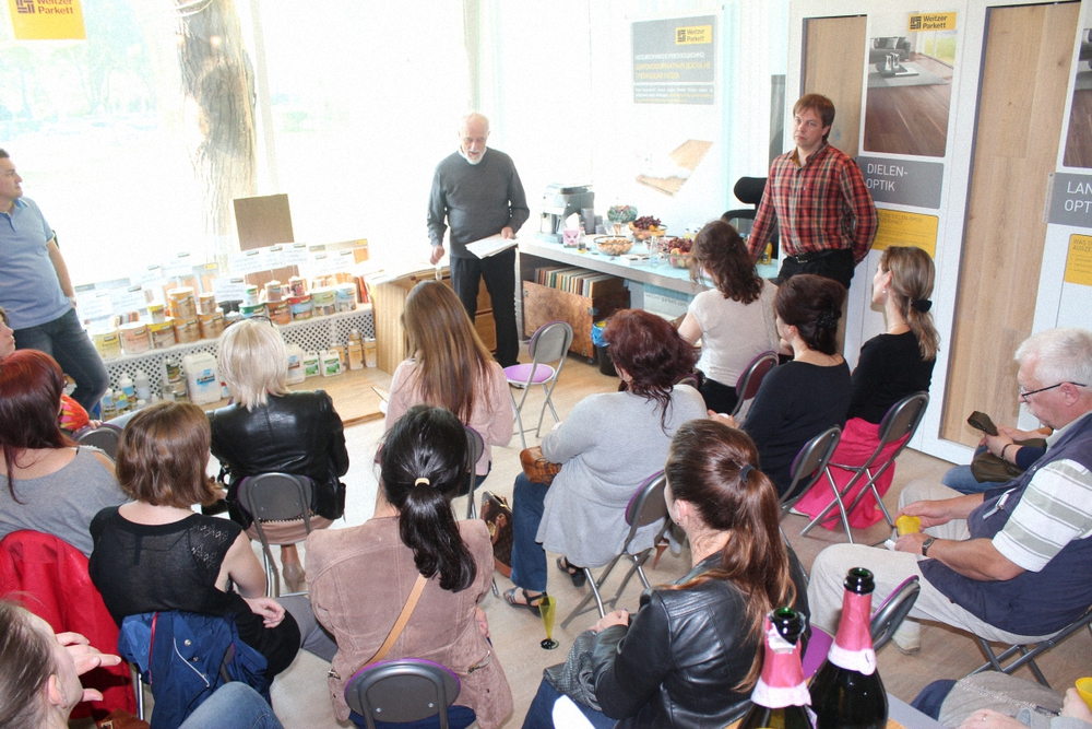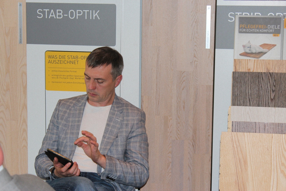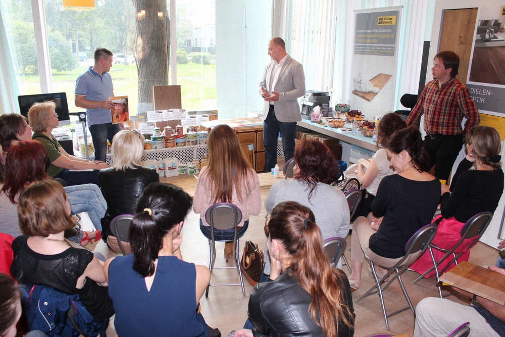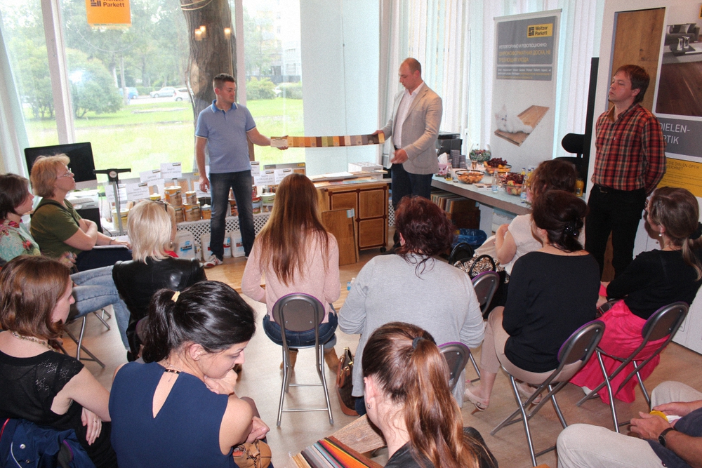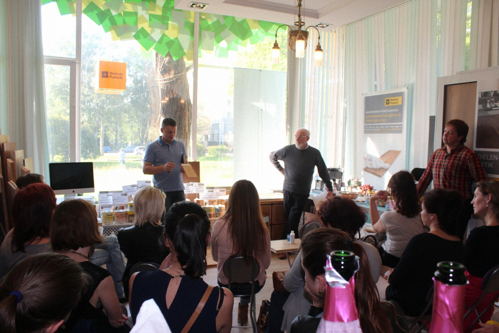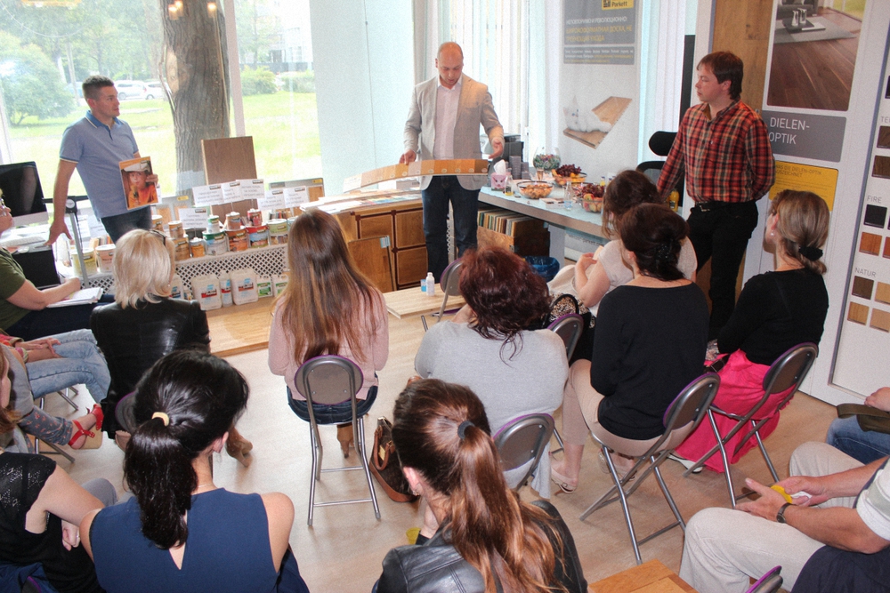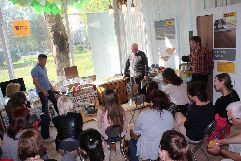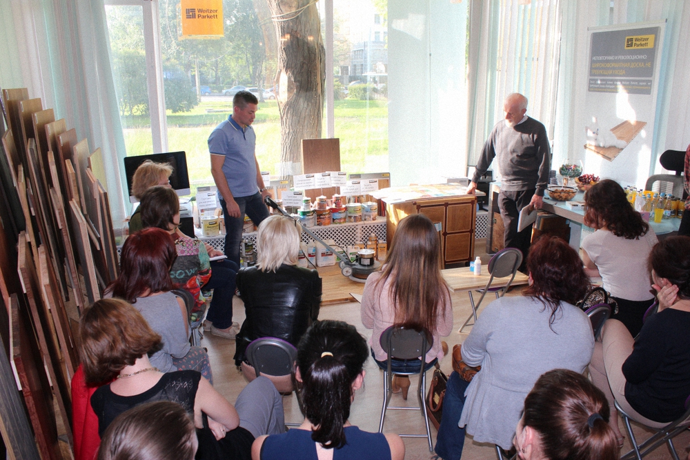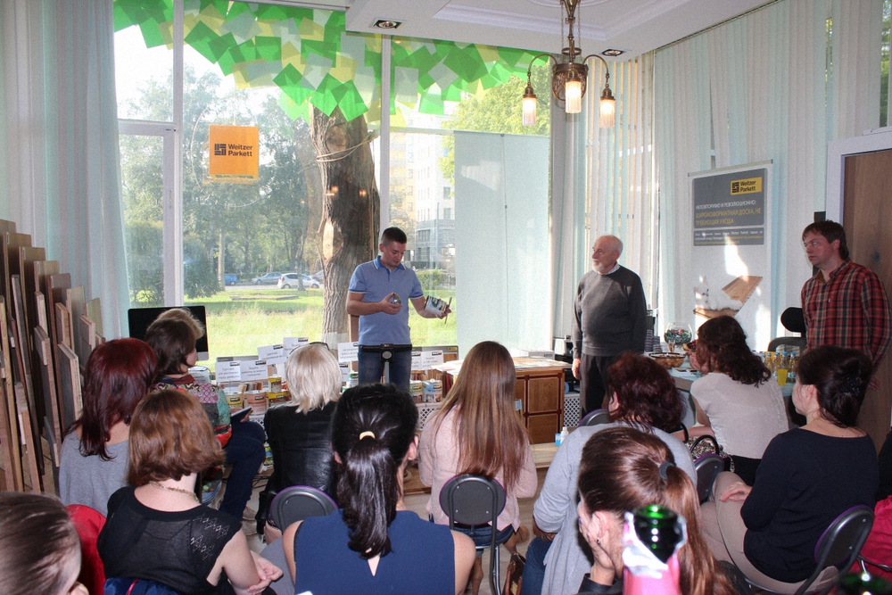 Он показал и рассказал присутствующим о тактильных свойствах дерева, о фаске, о видах брашировок, об открытых порах, о быстром искусственном состаривании паркета.