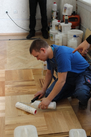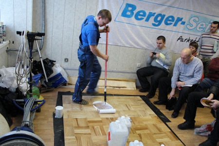 На семинаре было представлено два вида паркетных лаков с высокой степенью износостойкости из большой линейки лаков Berger. Это двухкомпонентный полиуретановый лак на водной основе Berger Aqua-Seal NanoDiamant, главным отличием от второго образца является высокая текучесть лака при нанесении. Второй - двухкомпонентный полиуретановый лак на водной основе Berger Aqua-Seal 2KPU, он отличается МАКСИМАЛЬНОЙ СТЕПЕНЬЮ ИЗНОСОСТОЙКОСТИ, а также возможностью с помощью профессиональный валика Berger UNO Rolle наносить толстые слои лака.