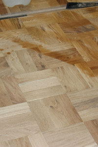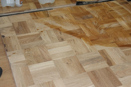 Для получения более насыщенного цвета тонировки поверхность смачивается водой. Поры древесины раскрываются, и после высыхания в них попадает больше тонирующего пигмента. Смачивание это простая, но важная операция, при тонировке, если не вся поверхность смочена, или если по полу ходили босиком или в носках, то при тонировке могут появиться пятна.