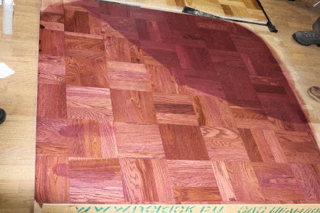 А вот и результат! Был дуб, стал Амарант! Поверхность, предварительно смоченная водой, «взяла» в себя больше пигмента, чем та, которая не подвергалась воздействию воды. Следы от потных ног также видны. Исправления занимают больше времени, чем «правильное» смачивание.