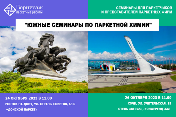 Компания «Вернисаж» приглашает паркетчиков и представителей паркетных фирм на южные семинары по паркетной химии, которые пройдут в Ростове-на-Дону 24 октября и в Сочи 26 октября 2023 г. Участникам семинаров будут выданы дипломы о прохождении курса лекций!