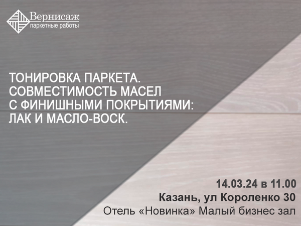 Уважаемые партнеры, специалисты паркетного бизнеса, мастера-укладчики и реставраторы, продавцы, все кто связан с паркетными работами и защитными покрытиями для древесины! Компания «Вернисаж» приглашает вас на практический семинар «Тонировка паркета. Совместимость масел с финишными покрытиями: лак и масло-воск».