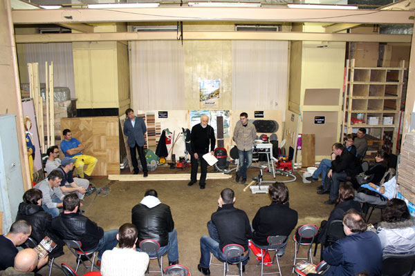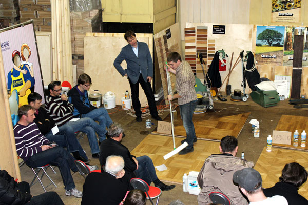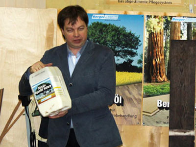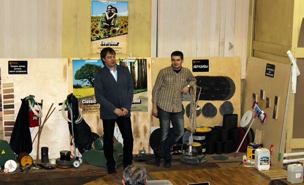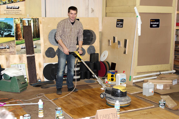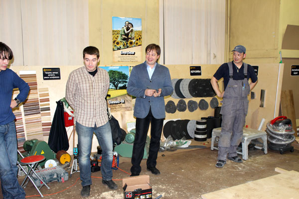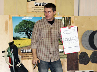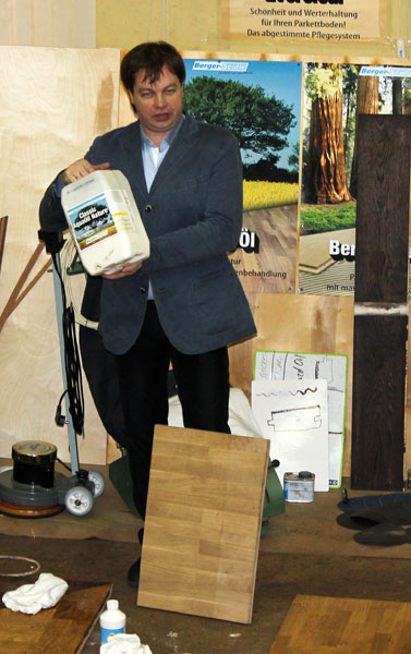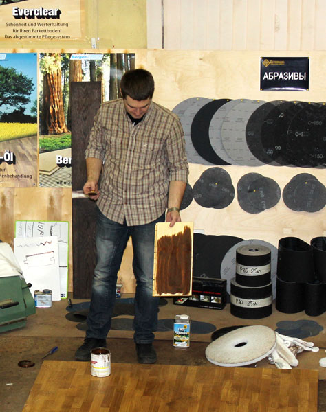 В первой половине мы обсуждали типы покрытий паркета, принципы защиты поверхностей, очистку, уход за паркетом. Была произведена демонстрация работы с каждым из средств по очистке и уходу за разными покрытиями немецкой фирмы Berger-Seidle.