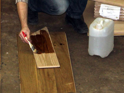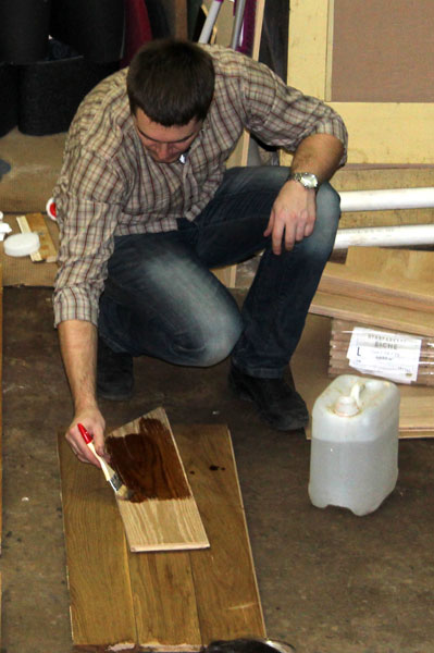 Леонид наносит на фрагмент массивной доски щелочной раствор для искусственного состаривания древесины Berger BioLye.