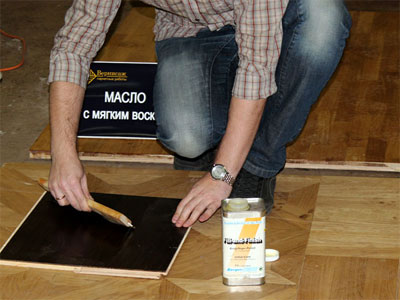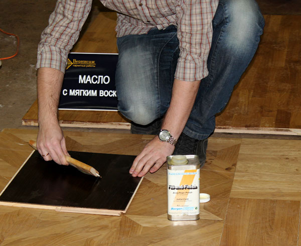 Хлебников Леонид демонстрирует нанесение средства по уходу за лакированным паркетом Berger Everclear.