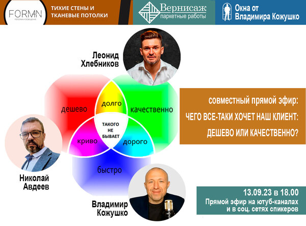 Уважаемые клиенты и партнеры! Компания «Вернисаж» приглашает вас 13 сентября на совместный прямой эфир с проектом «Центр Притяжения» в г. Москва и Владимиром Кожушко на тему «Чего все-таки хочет наш клиент – дешево или качественно?»