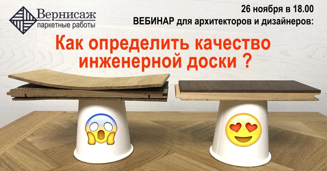 Уважаемые партнеры! Компания «Вернисаж» приглашает архитекторов и дизайнеров на вебинар «Как определить качество инженерной доски». В прямом эфире вы сможете задать любые вопросы об инженерной доске и получить проверенную информацию.
