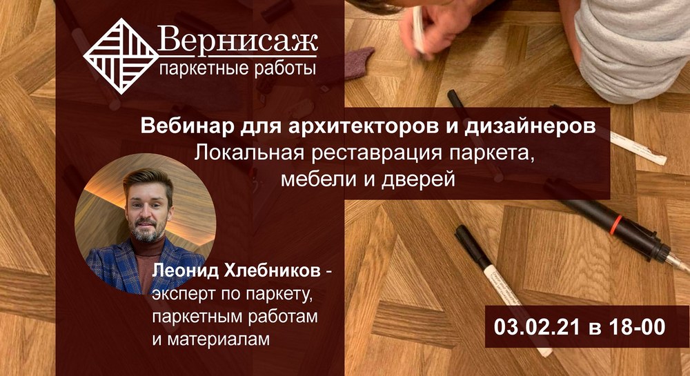 Уважаемые партнеры! Компания «Вернисаж» провела вебинар для архитекторов и дизайнеров на тему «Локальная реставрация паркета, мебели, дверей и других поверхностей». Если вы пропустили вебинар, предлагаем вам посмотреть его в записи: