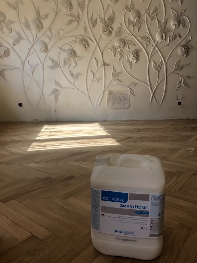 - Покрытие паркета однокомпонентным акриловым лаком на водной основе Berger Aqua-Seal SmartHome