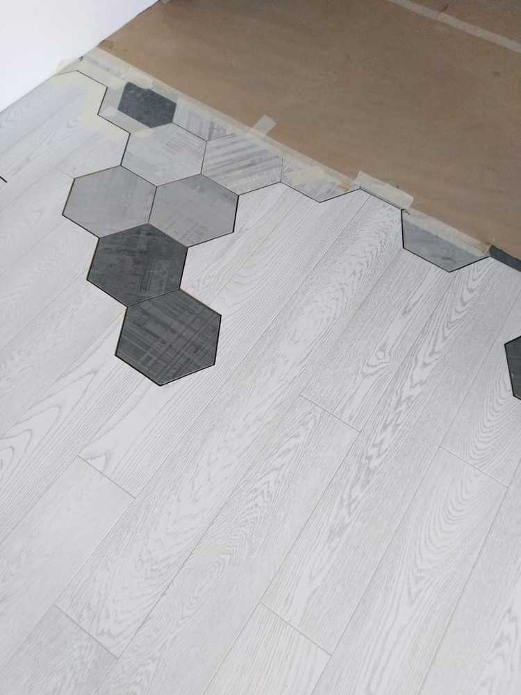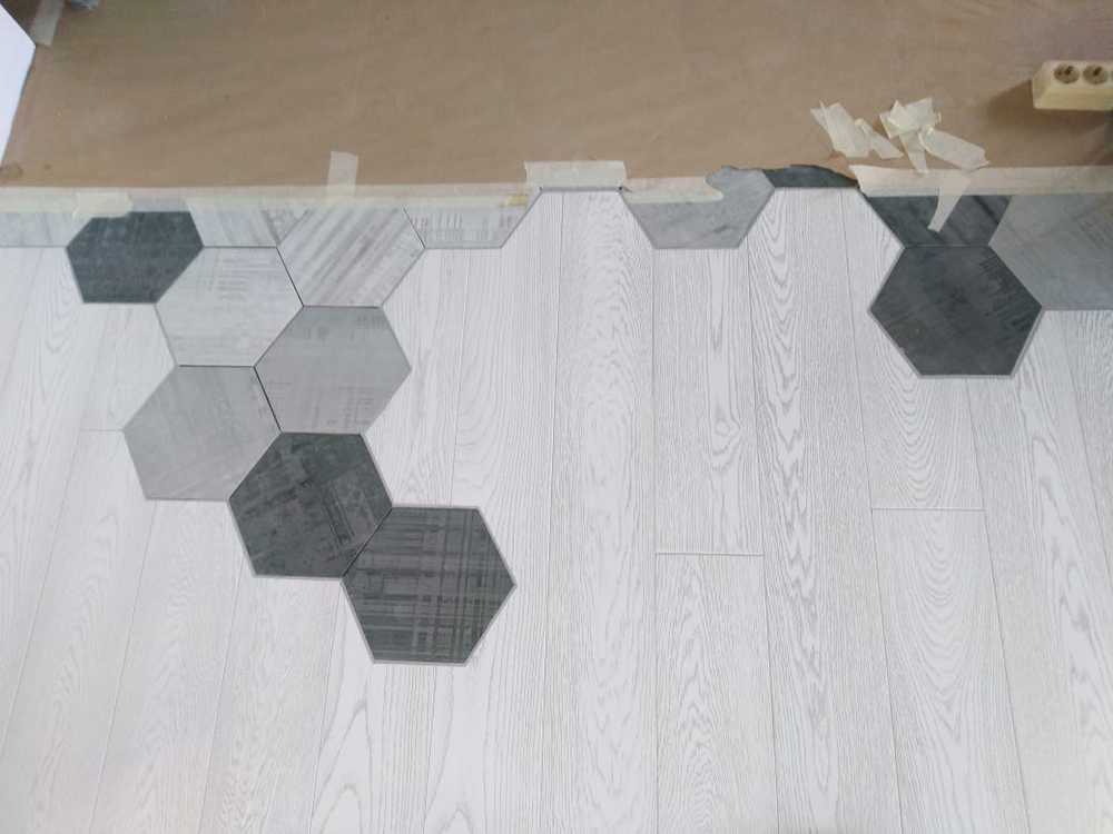Компания «Вернисаж» выполнила заказ по укладке паркета в частной квартире в Москве (Химки). Изначально стыковка с «гексагонами» планировалась по прямой линии, но заказчик пересмотрел решение в пользу целых элементов с заходом в паркетное поле, что с технической стороны более сложно, но наши мастера успешно справились с этой задачей.