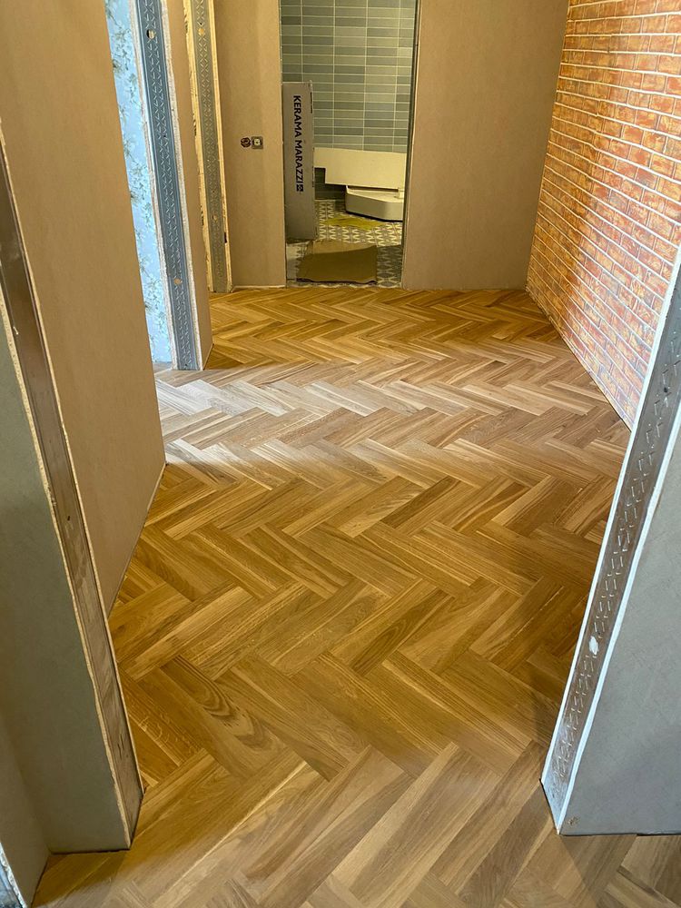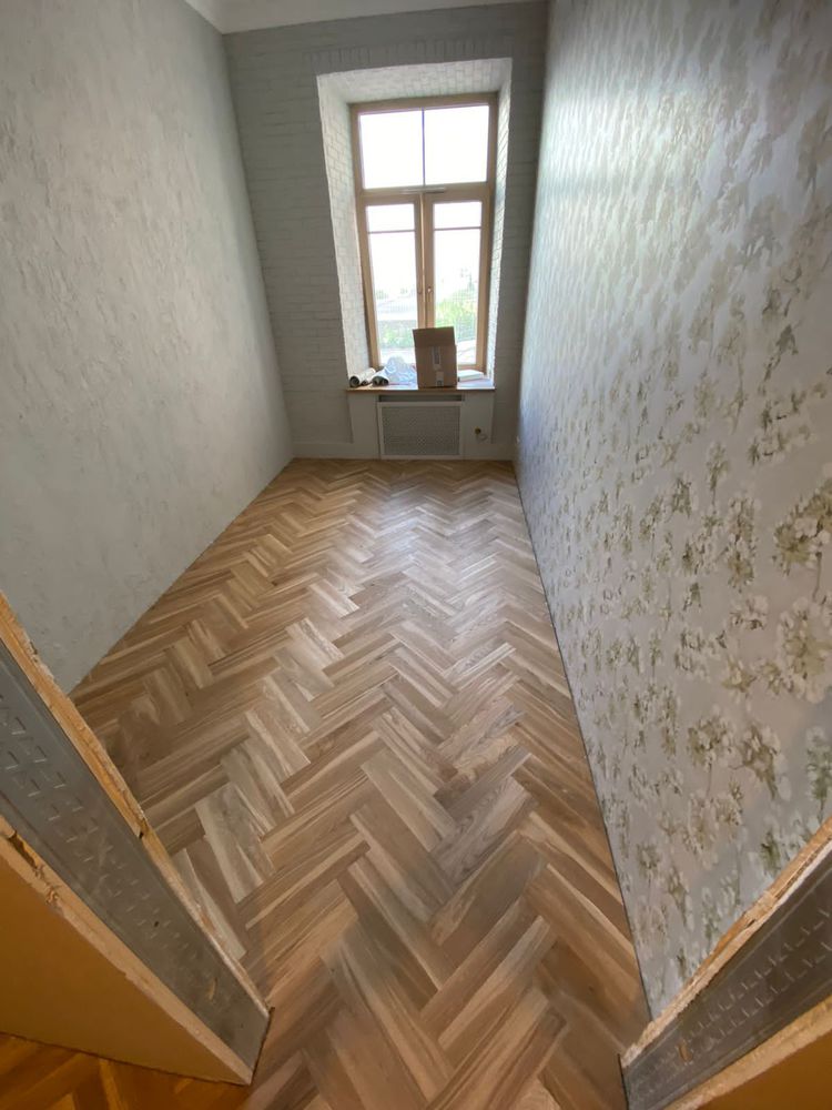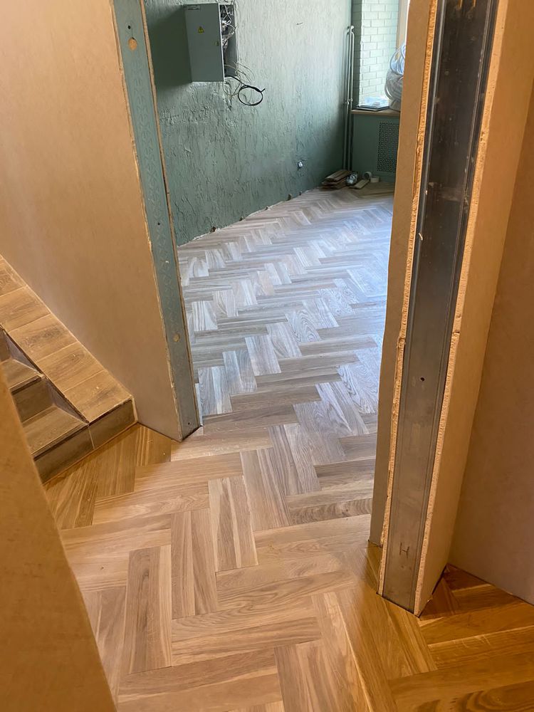 Мастера компании «Вернисаж» выполнили в Санкт-Петербурге укладку штучного паркета рисунком «двойная елка» из шоколадного дуба двух сортировок: рустик и натур 420х70х15 мм.