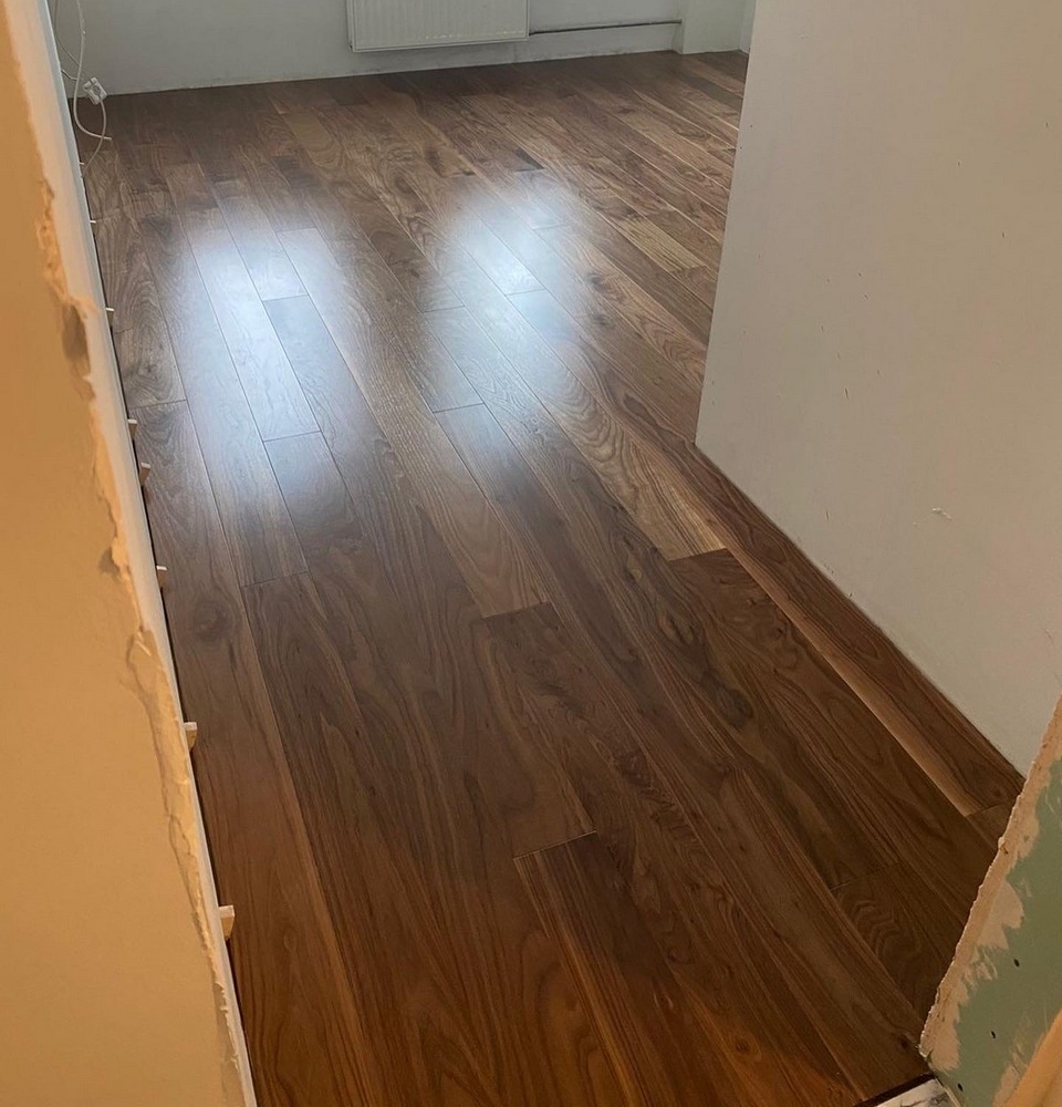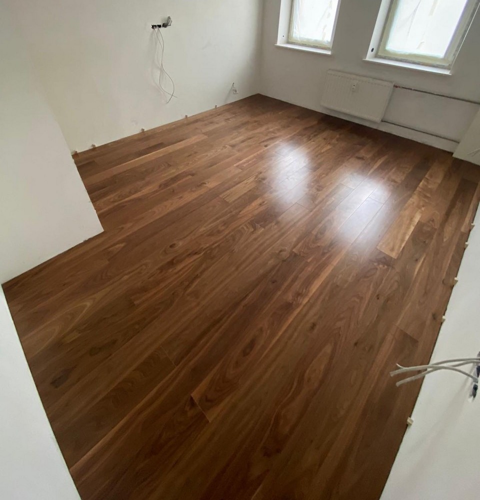 - Настил замковой трехслойной паркетной доски Орех 14x138х2000 мм c заводским лаковым покрытием с приклеиванием к основанию