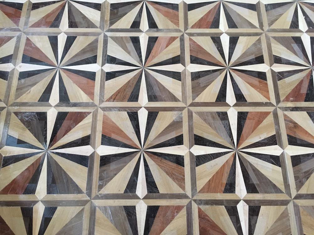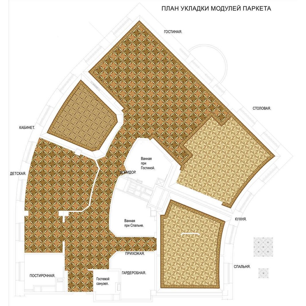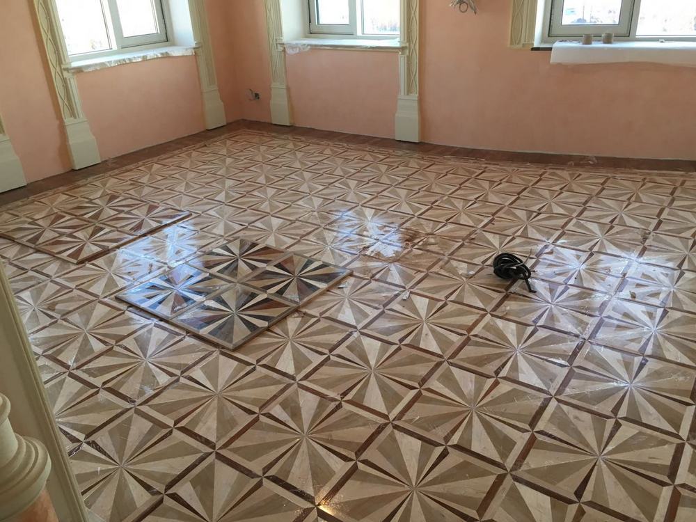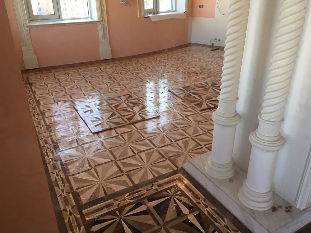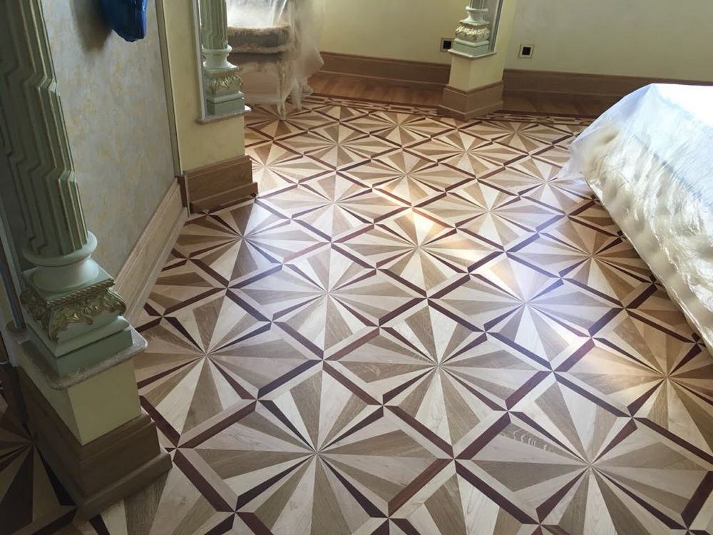 Компания «Вернисаж» выполнила частный заказ по укладке геометрического паркета. Это большой проект со сложной геометрией как самих рисунков, так и помещений.